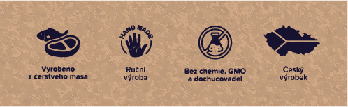 Ručně vyráběná pochoutka pro psy s vysokým obsahem ČERSTVÉHO jehněčího, telecího a hovězího masa (celkem 78,5%), bez použití chemie, konzervantů, dochucovadel, barviv, lepku, GMO, soli, cukru a přidaného škrobu. Maso v pamlsku je zpracováno pozvolným sušením, čímž zůstávají zachovány cenné nutriční hodnoty a je obohaceno o amarantovou mouku a černý rybíz. Pochoutka je bohatá na antioxidanty, přispívá k dobrému trávení, podporuje imunitní systém, regeneraci buněk, pozitivně ovlivňuje hladinu cholesterolu, zpomaluje proces stárnutí, obsahuje omega-3 mastné kyseliny a prospěšnou kyselinu linolovou.