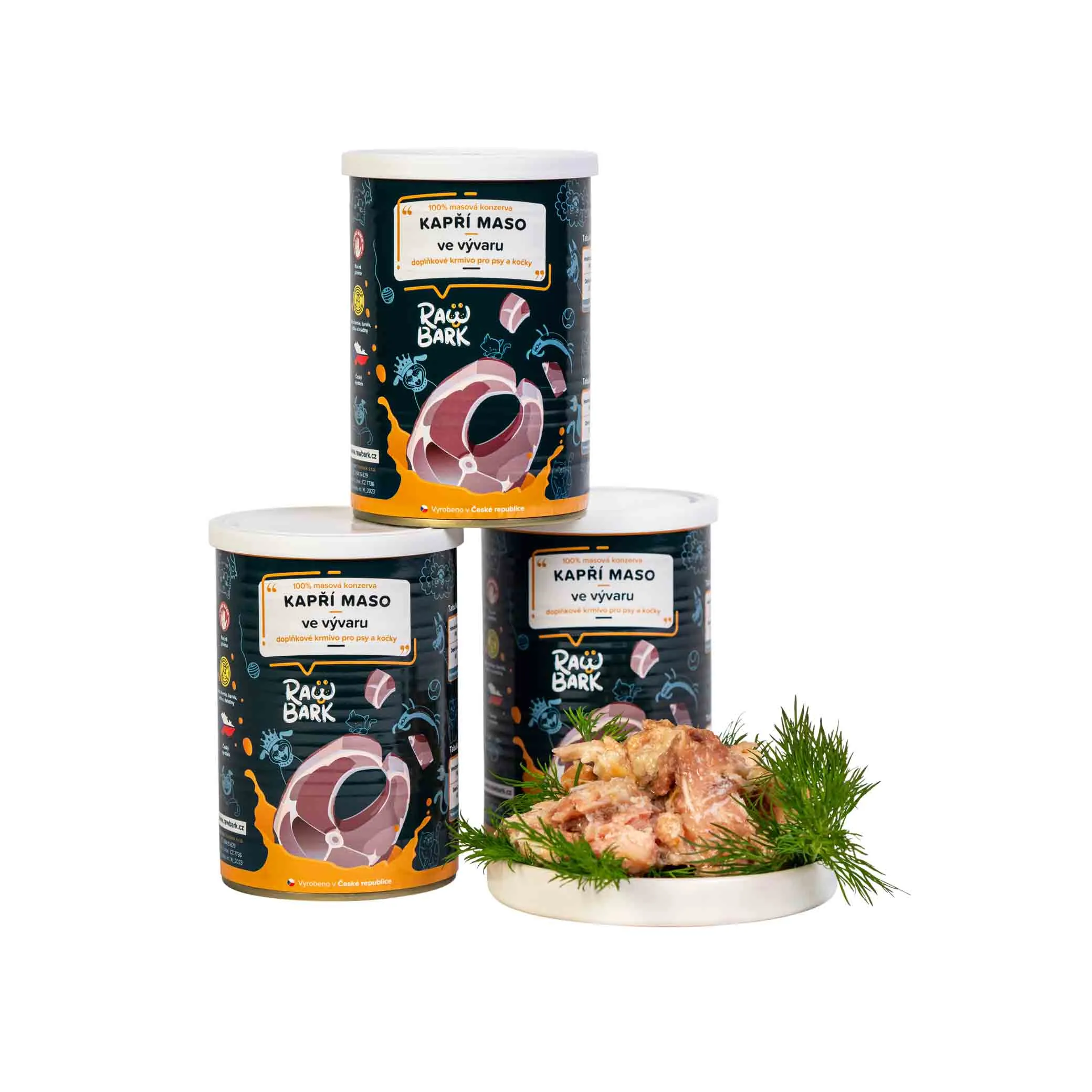 Kapří RawBark konzerva je ručně plněná kousky 100% kapří svaloviny ve vývaru (včetně měkčených kostí). Konzerva je vhodná pro opravdové masožravce, kteří chtějí baštit bez chemie, barviv, aditiv, dochucovadel a želatiny. Konzervy mají praktické plastové víčko, kterým je můžete po otevření znovu uzavřít a skladovat v chladničce až 48hodin. Tato konzerva je určena pro všechny věkové kategorie psů i koček. Konzerva má vysokou stravitelnost a měkká sousta mohou ocenit Vaši miláčci, kteří mají problémy se žvýkáním a zoubky. Šťavnatost konzervy a obsah vývaru je vhodný pro pejsky a kočičky, kteří málo pijí, mají problémy se suchou stravou nebo refluxem. Kapří maso má jedinečné výživové vlastnosti, které jsou ideální pro podporu celkového zdraví Vašich psích i kočičích společníků. Je výborným zdrojem snadno stravitelných bílkovin, klíčových pro udržení svalové hmoty. Tato ryba je bohatá na omega-3 mastné kyseliny, které jsou nezbytné pro udržení zdravé kůže a lesklé srsti, zároveň podporují zdravé srdce a působí protizánětlivě. Kapří maso obsahuje významné množství vitamínů D a B12, důležitých pro podporu zdravých kostí a správného fungování nervového systému. Tyto vitamíny, spolu s minerály jako jsou selen a jód, přispívají k posílení imunitního systému a zajišťují správnou funkci štítné žlázy. Kapr má přirozený obsah taurinu, který je důležitý pro srdce a zrak. Díky svému vysokému obsahu minerálů, jako je fosfor, který je důležitý pro zdraví kostí a zubů, a železa, nezbytného pro správnou krvetvorbu, je kapří konzerva ideálním řešením pro udržení celkového zdraví vašich zvířecích kamarádů.