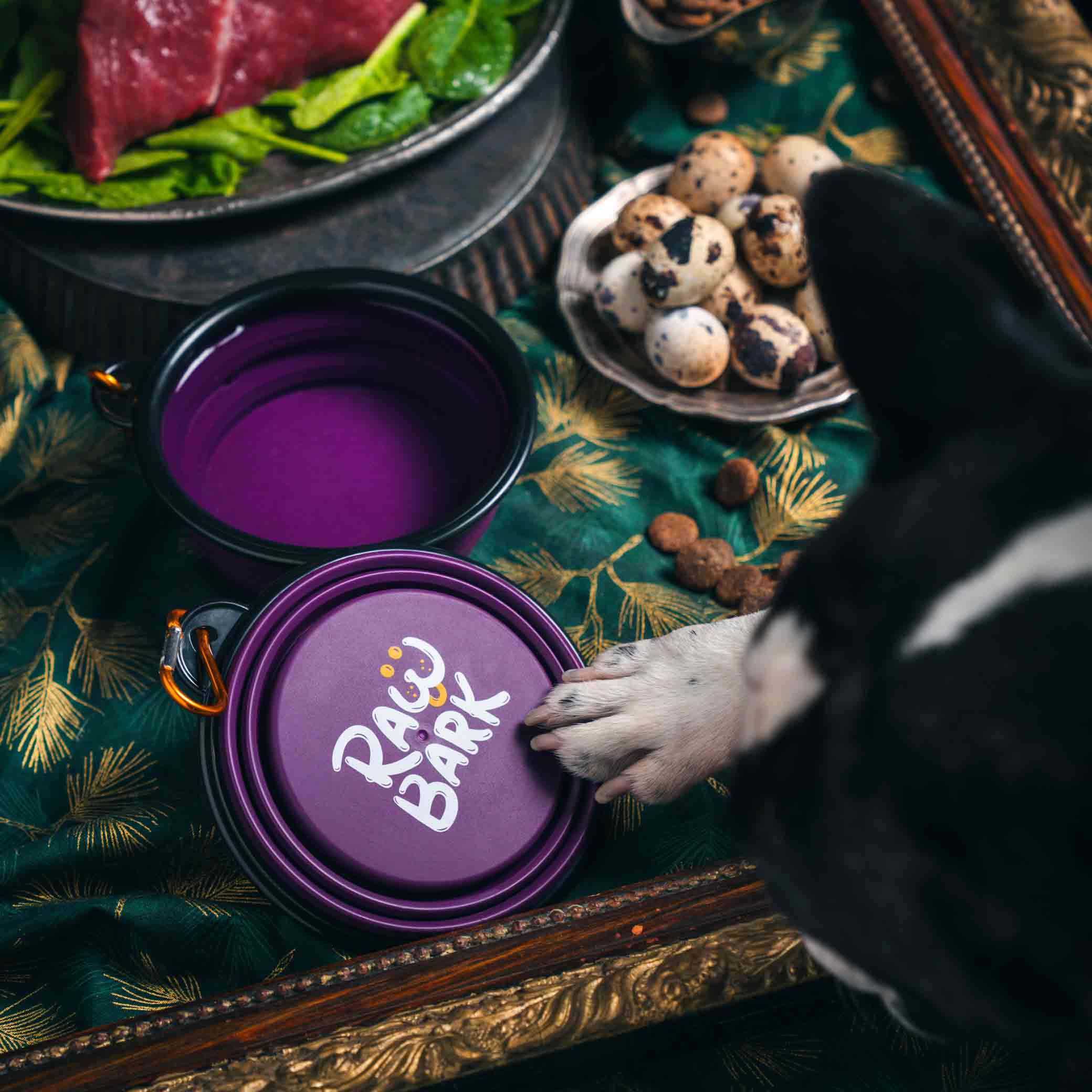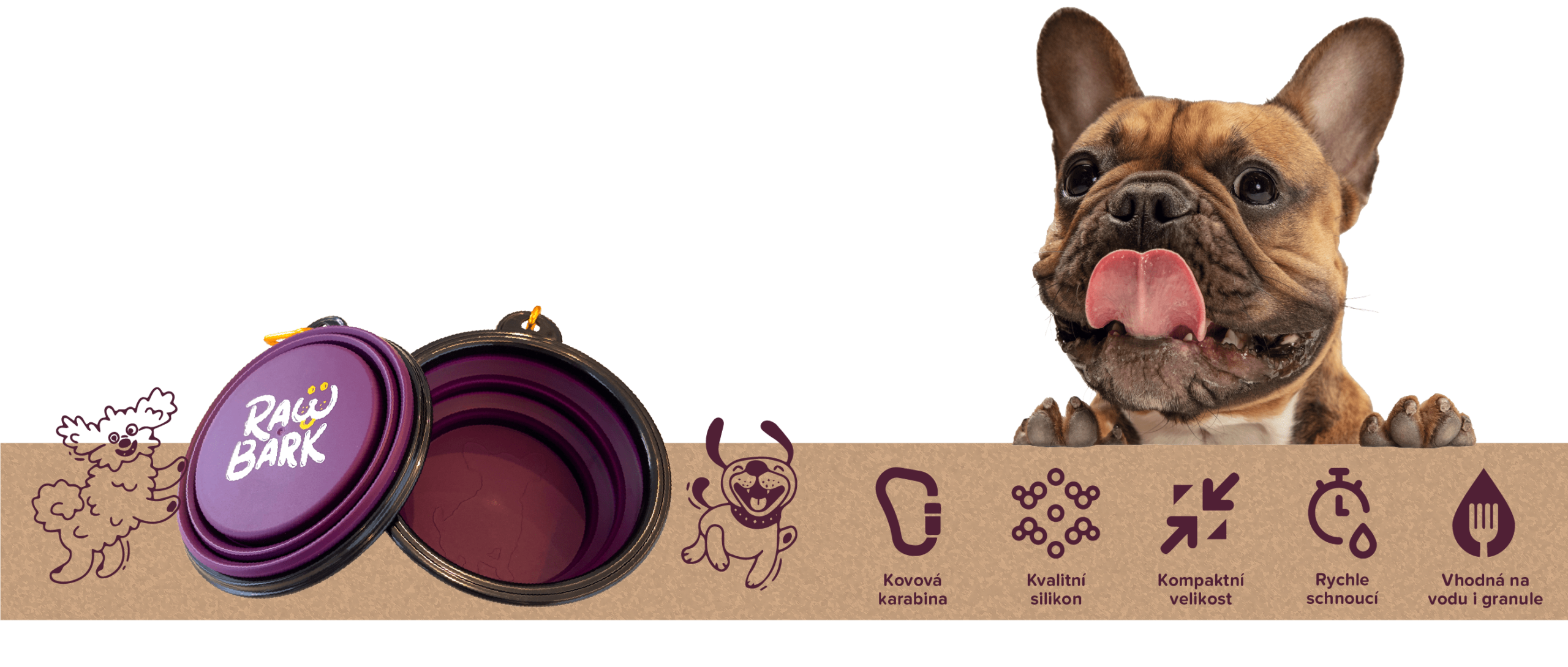 - Materiál: miska je vyrobena z kvalitního, zdravotně nezávadného, matného silikonu. Horní okraj misky je plastový a karabina je z kovu. Vyrobeno mimo EU.