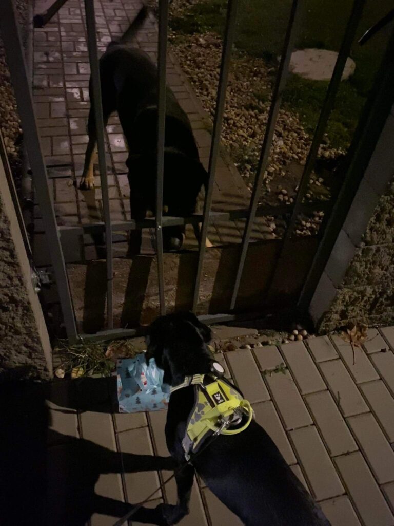 Hned naproti bydlí taková malá divoška, která se naučila vykroutit se jako žížala z kšírek, což je opravdu zábavné, teda aspoň podle mě. Vždycky když už je noc, tak chodíme na procházku a její panička jí pustí, ať se na dobrou noc vyběháme, to je moc príma. Zvoníme a vychází páníček, že jsou doma nemocní, a tak jen rychle předáváme dáreček a přejeme zdravíčko!